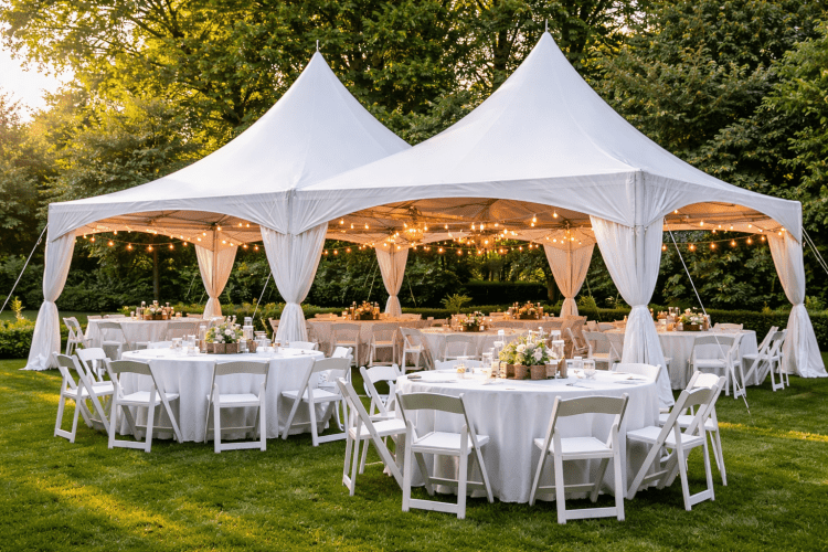 A graceful, peak‑topped event tent designed to create an elegant covered space for gatherings of all kinds. The tall center peak gives the tent an airy, open feel and helps shed rainwater, while the clean lines and simple silhouette suit weddings, receptions, corporate events, backyard parties, and other special occasions. As a rental item, it provides reliable shelter from sun and light weather, defines a focal area for seating or activities, and elevates the look of any outdoor setting without overpowering the surroundings. Easy to dress with lighting, drape, or seasonal décor, the High Peak Tent is a versatile choice when you want a polished, protected space that feels both festive and refined.
